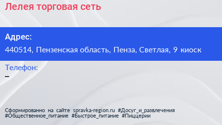Лелея, торговая сеть по адресу 440514, Пензенская область, Пенза, Светлая, 9 киоск в дальнейшем Организация, размещена в следующих категориях: