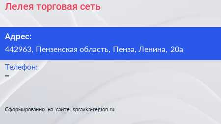 Лелея, торговая сеть по адресу 442963, Пензенская область, Пенза, Ленина, 20а в дальнейшем Организация, размещена в следующих категориях: