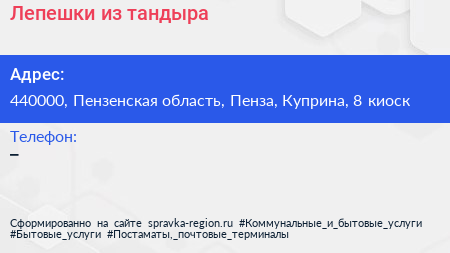 Лепешки из тандыра по адресу 440000, Пензенская область, Пенза, Куприна, 8 киоск в дальнейшем Организация, размещена в следующих категориях: