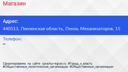 Магазин по адресу 440513, Пензенская область, Пенза, Механизаторов, 15 в дальнейшем Организация, размещена в следующих категориях: