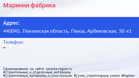 Маринни, фабрика по адресу 440045, Пензенская область, Пенза, Арбековская, 50 к1 в дальнейшем Организация, размещена в следующих категориях: