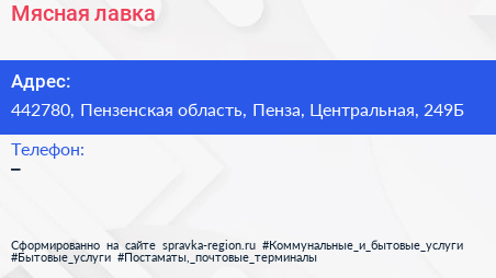 Мясная лавка по адресу 442780, Пензенская область, Пенза, Центральная, 249Б в дальнейшем Организация, размещена в следующих категориях: