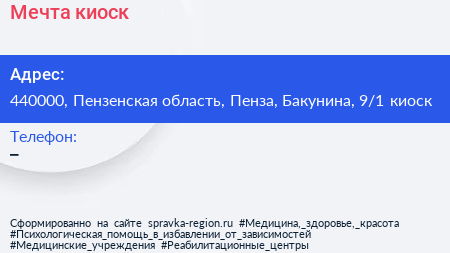 Мечта, киоск по адресу 440000, Пензенская область, Пенза, Бакунина, 9/1 киоск в дальнейшем Организация, размещена в следующих категориях: