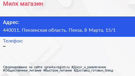 Милк, магазин по адресу 440011, Пензенская область, Пенза, 8 Марта, 15/1 в дальнейшем Организация, размещена в следующих категориях: