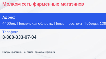 Молком, сеть фирменных магазинов по адресу 440066, Пензенская область, Пенза, проспект Победы, 138 в дальнейшем Организация, размещена в следующих категориях: