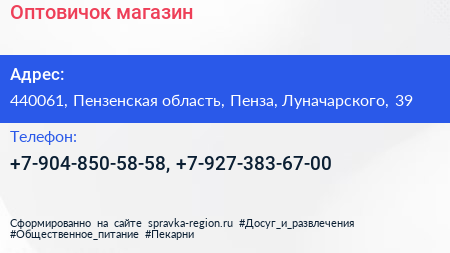 Оптовичок, магазин по адресу 440061, Пензенская область, Пенза, Луначарского, 39 в дальнейшем Организация, размещена в следующих категориях: