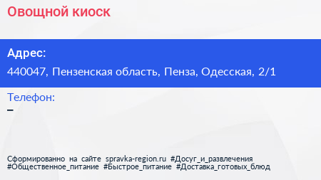 Овощной киоск по адресу 440047, Пензенская область, Пенза, Одесская, 2/1 в дальнейшем Организация, размещена в следующих категориях: