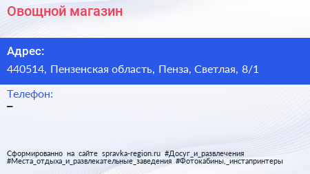 Овощной магазин по адресу 440514, Пензенская область, Пенза, Светлая, 8/1 в дальнейшем Организация, размещена в следующих категориях: