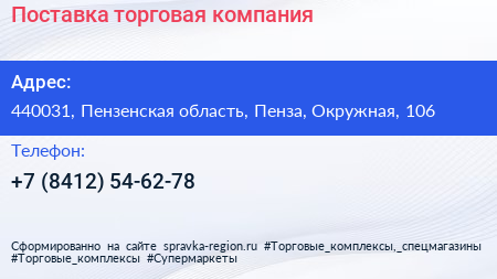Поставка, торговая компания по адресу 440031, Пензенская область, Пенза, Окружная, 106 в дальнейшем Организация, размещена в следующих категориях: