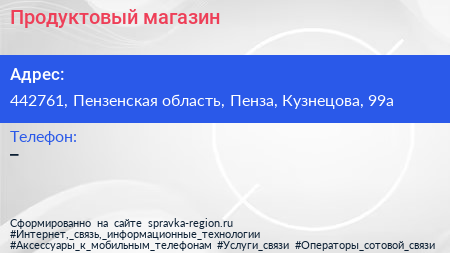 Продуктовый магазин по адресу 442761, Пензенская область, Пенза, Кузнецова, 99а в дальнейшем Организация, размещена в следующих категориях: