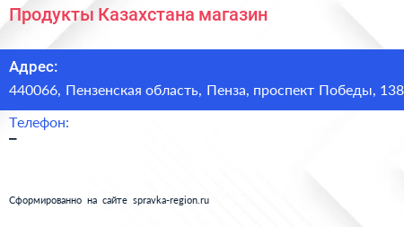 Продукты Казахстана, магазин по адресу 440066, Пензенская область, Пенза, проспект Победы, 138 в дальнейшем Организация, размещена в следующих категориях: