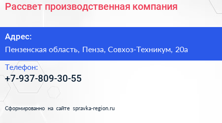 Рассвет, производственная компания по адресу Пензенская область, Пенза, Совхоз-Техникум, 20а в дальнейшем Организация, размещена в следующих категориях: