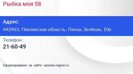 Рыбка моя 58 по адресу 442963, Пензенская область, Пенза, Зелёная, 10е в дальнейшем Организация, размещена в следующих категориях: