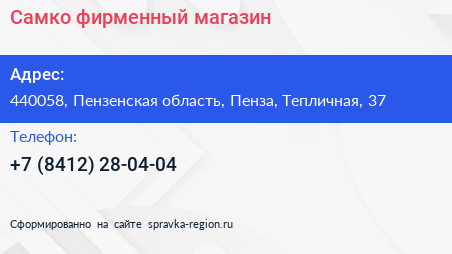 Самко, фирменный магазин по адресу 440058, Пензенская область, Пенза, Тепличная, 37 в дальнейшем Организация, размещена в следующих категориях: