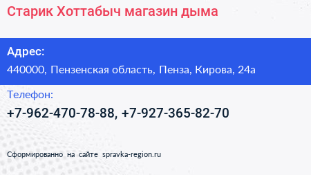 Старик Хоттабыч, магазин дыма по адресу 440000, Пензенская область, Пенза, Кирова, 24а в дальнейшем Организация, размещена в следующих категориях: