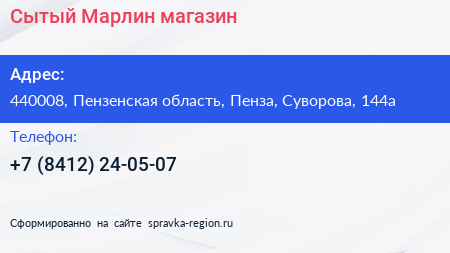 Сытый Марлин, магазин по адресу 440008, Пензенская область, Пенза, Суворова, 144а в дальнейшем Организация, размещена в следующих категориях: