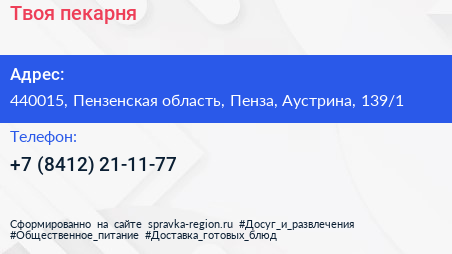 Твоя пекарня по адресу 440015, Пензенская область, Пенза, Аустрина, 139/1 в дальнейшем Организация, размещена в следующих категориях: