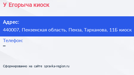 У Егорыча, киоск по адресу 440007, Пензенская область, Пенза, Тарханова, 11Б киоск в дальнейшем Организация, размещена в следующих категориях: