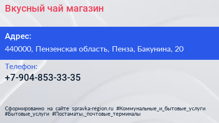 Вкусный чай, магазин по адресу 440000, Пензенская область, Пенза, Бакунина, 20 в дальнейшем Организация, размещена в следующих категориях:
