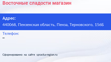 Восточные сладости, магазин по адресу 440068, Пензенская область, Пенза, Терновского, 156Б в дальнейшем Организация, размещена в следующих категориях: