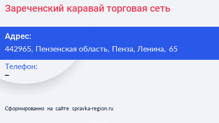 Зареченский каравай, торговая сеть по адресу 442965, Пензенская область, Пенза, Ленина, 65 в дальнейшем Организация, размещена в следующих категориях: