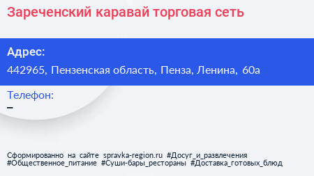 Зареченский каравай, торговая сеть по адресу 442965, Пензенская область, Пенза, Ленина, 60а в дальнейшем Организация, размещена в следующих категориях: