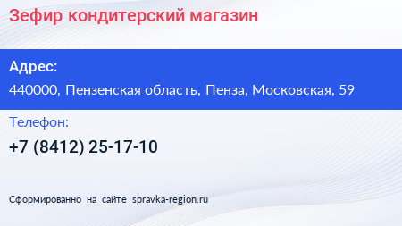 Зефир, кондитерский магазин по адресу 440000, Пензенская область, Пенза, Московская, 59 в дальнейшем Организация, размещена в следующих категориях: