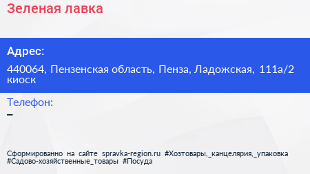 Зеленая лавка по адресу 440064, Пензенская область, Пенза, Ладожская, 111а/2 киоск в дальнейшем Организация, размещена в следующих категориях: