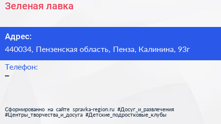 Зеленая лавка по адресу 440034, Пензенская область, Пенза, Калинина, 93г в дальнейшем Организация, размещена в следующих категориях: