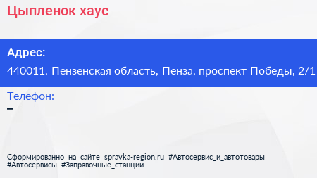 Цыпленок хаус по адресу 440011, Пензенская область, Пенза, проспект Победы, 2/1 в дальнейшем Организация, размещена в следующих категориях: