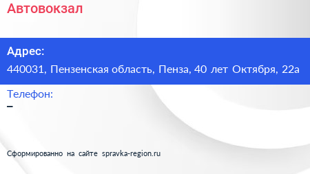 Автовокзал по адресу 440031, Пензенская область, Пенза, 40 лет Октября, 22а в дальнейшем Организация, размещена в следующих категориях: