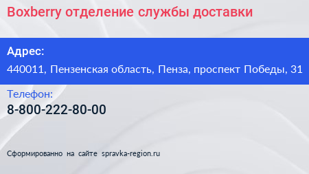 Boxberry, отделение службы доставки по адресу 440011, Пензенская область, Пенза, проспект Победы, 31 в дальнейшем Организация, размещена в следующих категориях: