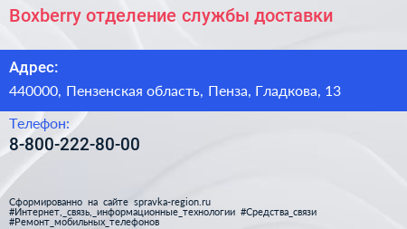 Boxberry, отделение службы доставки по адресу 440000, Пензенская область, Пенза, Гладкова, 13 в дальнейшем Организация, размещена в следующих категориях:
