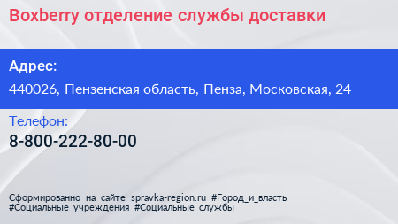 Boxberry, отделение службы доставки по адресу 440026, Пензенская область, Пенза, Московская, 24 в дальнейшем Организация, размещена в следующих категориях: