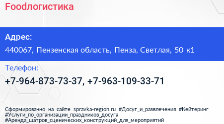 Foodлогистика по адресу 440067, Пензенская область, Пенза, Светлая, 50 к1 в дальнейшем Организация, размещена в следующих категориях: