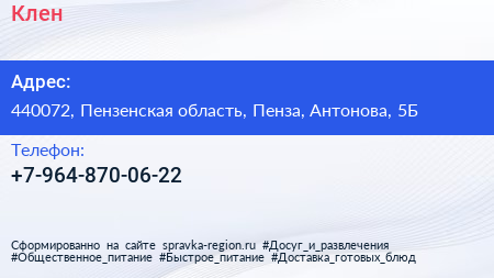 Клен по адресу 440072, Пензенская область, Пенза, Антонова, 5Б в дальнейшем Организация, размещена в следующих категориях:
