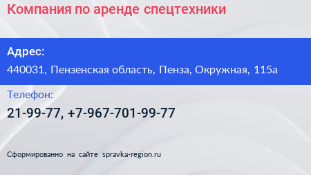 Компания по аренде спецтехники по адресу 440031, Пензенская область, Пенза, Окружная, 115а в дальнейшем Организация, размещена в следующих категориях: