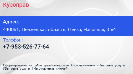 Кузоправ по адресу 440061, Пензенская область, Пенза, Насосная, 3 к4 в дальнейшем Организация, размещена в следующих категориях: