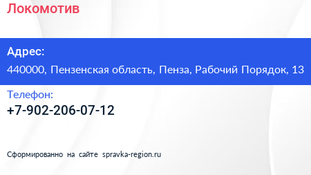 Локомотив по адресу 440000, Пензенская область, Пенза, Рабочий Порядок, 13 в дальнейшем Организация, размещена в следующих категориях: