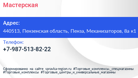 Мастерская по адресу 440513, Пензенская область, Пенза, Механизаторов, 8а к1 в дальнейшем Организация, размещена в следующих категориях: