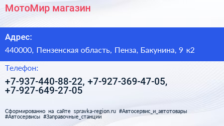 МотоМир, магазин по адресу 440000, Пензенская область, Пенза, Бакунина, 9 к2 в дальнейшем Организация, размещена в следующих категориях:
