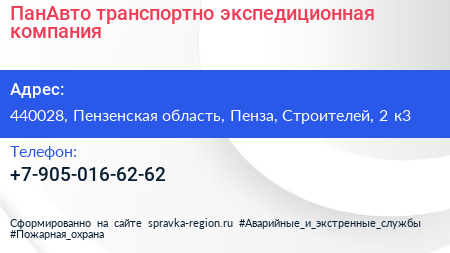 ПанАвто, транспортно-экспедиционная компания по адресу 440028, Пензенская область, Пенза, Строителей, 2 к3 в дальнейшем Организация, размещена в следующих категориях: