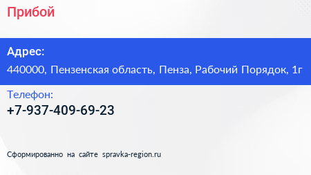 Прибой по адресу 440000, Пензенская область, Пенза, Рабочий Порядок, 1г в дальнейшем Организация, размещена в следующих категориях: