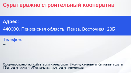 Сура, гаражно-строительный кооператив по адресу 440000, Пензенская область, Пенза, Восточная, 28Б в дальнейшем Организация, размещена в следующих категориях: