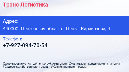 Транс-Логистика по адресу 440000, Пензенская область, Пенза, Каракозова, 4 в дальнейшем Организация, размещена в следующих категориях: