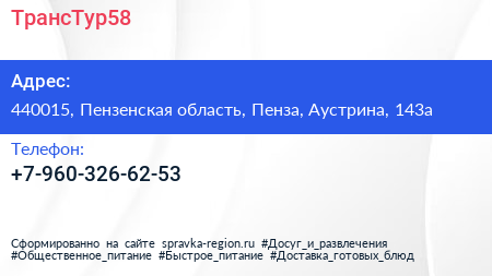 ТрансТур58 по адресу 440015, Пензенская область, Пенза, Аустрина, 143а в дальнейшем Организация, размещена в следующих категориях:
