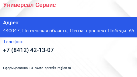 Универсал Сервис по адресу 440047, Пензенская область, Пенза, проспект Победы, 65 в дальнейшем Организация, размещена в следующих категориях:
