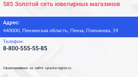 585 Золотой, сеть ювелирных магазинов по адресу 440000, Пензенская область, Пенза, Плеханова, 19 в дальнейшем Организация, размещена в следующих категориях: