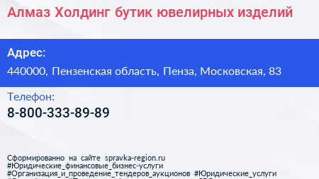 Алмаз-Холдинг, бутик ювелирных изделий по адресу 440000, Пензенская область, Пенза, Московская, 83 в дальнейшем Организация, размещена в следующих категориях: