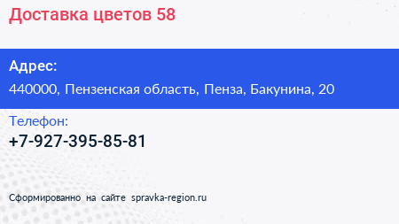 Доставка цветов 58 по адресу 440000, Пензенская область, Пенза, Бакунина, 20 в дальнейшем Организация, размещена в следующих категориях: